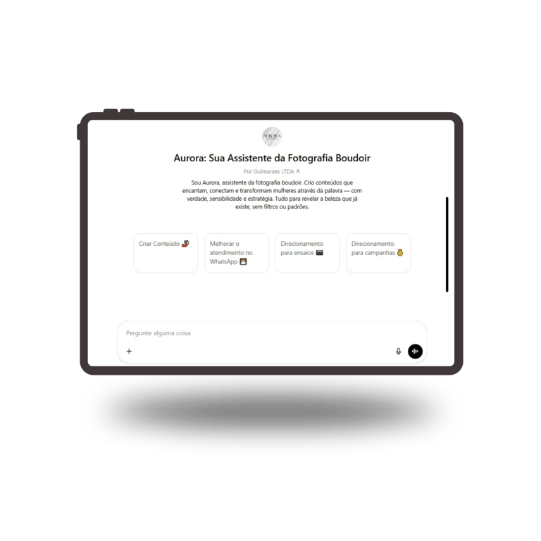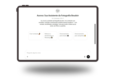 Criada para guiar Fotógrafas boudoir. Criando conteúdos, ofertas, campanhas e auxiliando no atendimento do WhatsApp e presencialmente, melhorando a experiência das clientes em cada ensaio. Criada para as Alunas da Fotógrafa Gabriela Fin.