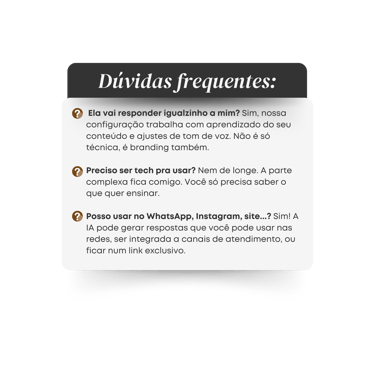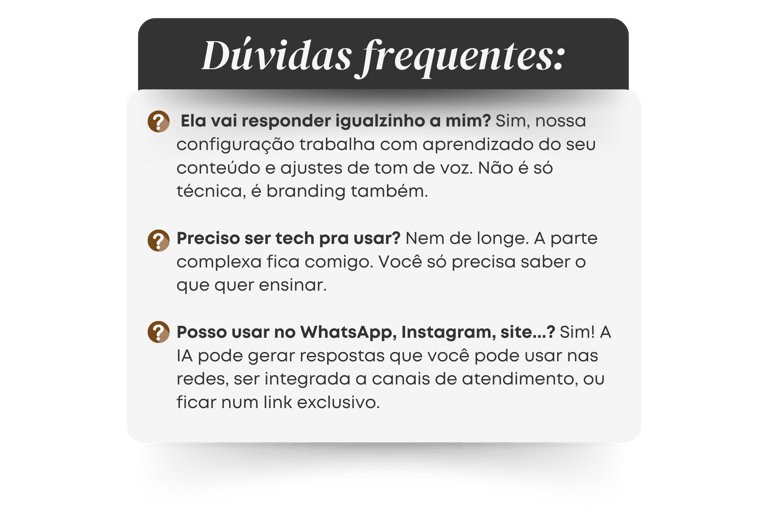 Transforme seu conhecimento em uma IA personalizada que responde como você, 24/7.
