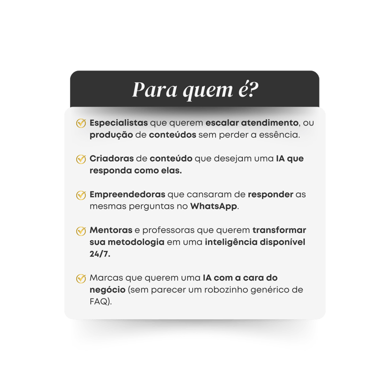 Cada IA que desenvolvo é única, com personalidade, linguagem e funções alinhadas à essência da Marca de cada cliente.